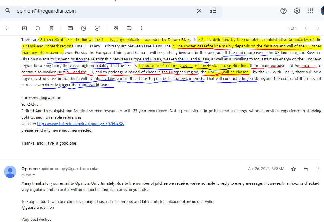 1. Ye QiQuan. Where will be ceasefire lines chosen in Ukrainian War. The submitted recept from Opinion Channel @guardian.co.uk. On April 26, 2022.